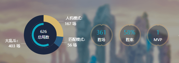 第一行显示的,是熟练度最高的前五名英雄,下面的百分比就是我们想要查看的胜率了,旁边的场次数,是从英雄首次被使用到最近一场使用的场次总和数量。