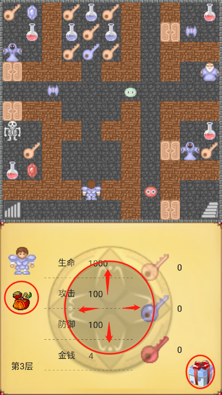 当我们安装完魔塔50层之后,我们就可以进入游戏了。首先进入游戏,我们点击开始游戏,就来到了我们熟悉的魔塔,想必此时老玩家已经开始直呼“爷青回”了。之后,我们可以看到游戏界面的下方有一个虚拟操纵杆,点击对应的位置我们就可以操控主角前后左右移动了。另外,点击虚拟操纵杆左侧的小福袋,我们就可以查看/使用我们在魔塔中获得的道具了,在道具的帮助下,我们可以又快有稳地通关魔塔。还有,在操纵杆的附近,我们还能看到自己的角色信息,包括攻击力、防御力、血量等。顺便提一下,这版魔塔还设置了内购,避免一些玩家打到半路卡关只能干瞪眼的尴尬,当然,要是技术好的玩家,可以无需内购,一命通关!