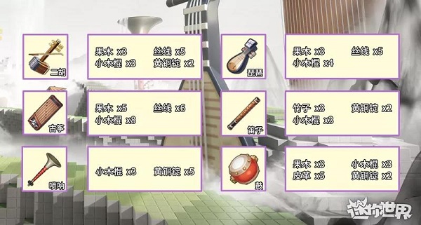 1、首先这些乐器都需要用到铜制制作台制作后才可以获得,同时每种乐器所需要的材料各不相同,冒险家要注意收集材料哦!