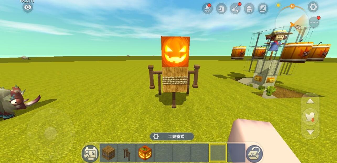 1、一个草垛,左右下方各摆上一个木头栅栏,上方再放一个南瓜灯,就可以形成稻草人。