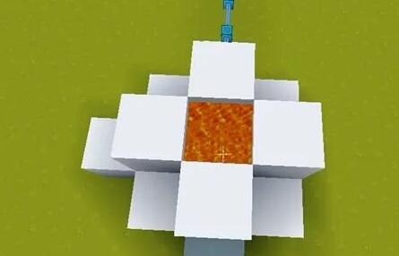 六、然后将水用方块盖住,做个中空的十字形,中间放一桶岩浆,这个岩浆刚好在机械臂推出的第二格上方。