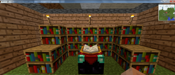 4、制作成附魔地点只要将附魔台放在在图书架中间就可以了,值得注意的是附魔台要和图书架保持一个方块的空间,还有图书架的数量一定要有15个以上。