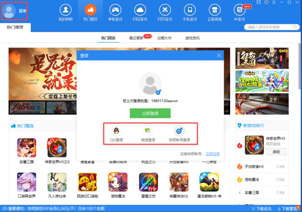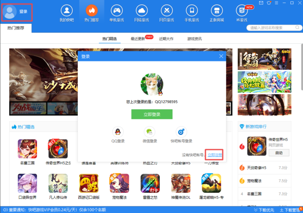 首先,想要登录到电脑版快吧游戏软件当中的话,我们就需要先来注册账号,或者是通过快吧游戏软件支持的QQ或微信账号进行登录。下面小编依次来为大家详细的介绍电脑版快吧游戏注册以及登录的方法。