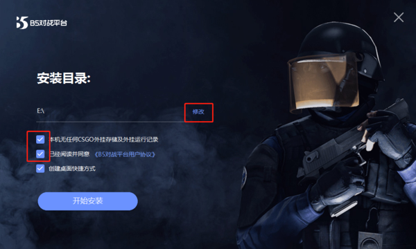 软件下载完成后,在电脑中找到安装程序,双击启动安装程序,跳转到安装目录界面后,如果需要改变安装路径,点击“修改”,找到需要存放的位置,更改后点击确定。在下方的确认无外挂行为以及《B5对战平台用户协议》前面的框里打勾,如果不需要创建快捷方式,点前面的勾去掉就可以了,最后单击下面的“开始安装”。
