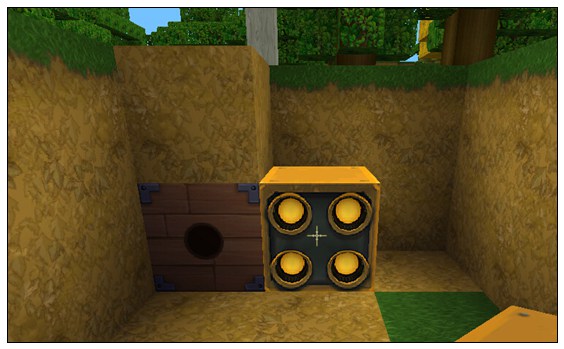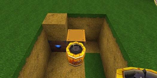 2、在墙角放一个感应方块,感应方块上方放一个土块,然后边上放一个发射器,放入一个火箭弹;(必须先放上方的土块,再放火箭弹哦,要不然会被炸!)