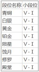 游戏中分为:青铜、白银、黄金、铂金、陨星、蚀月、无间修罗七个大段位,除了无间修罗这一大段位不分小段位外,其余六个大段位每一个大段位各分为五个小段位,也就是青铜Ⅴ、青铜Ⅳ、青铜Ⅲ、青铜Ⅱ、青铜Ⅰ这三个小段位。玩家的初始段位分为1000分,每增加100分就会自动上升一个小段位。