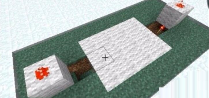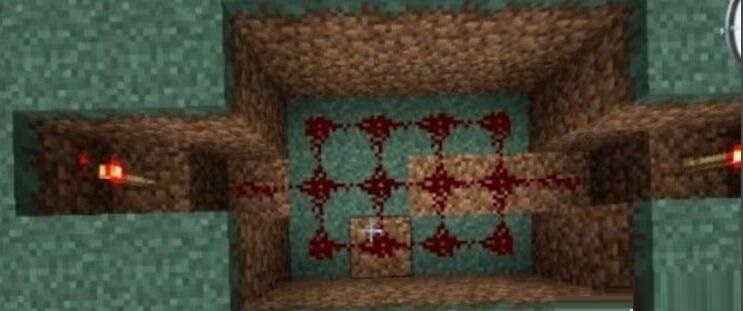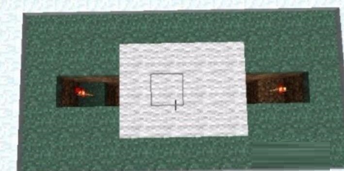 然后如图所示,在坑底部铺上红石,接着继续在细沟的较高地面,安上红石火把,即可完成初步创建。