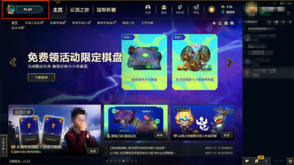 1、在进入英雄联盟官方客户端后,点击左上角的“PLAY”键。