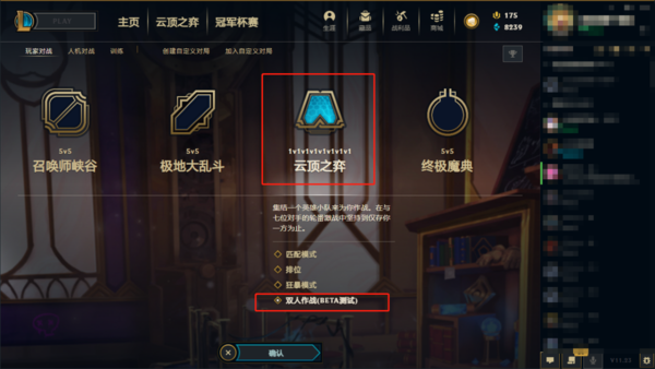 2、在游戏模式中,选择“云顶之弈”项后,点击位于最下方的“双人作战BETA测试”,即可进入双人云顶之奕模式。