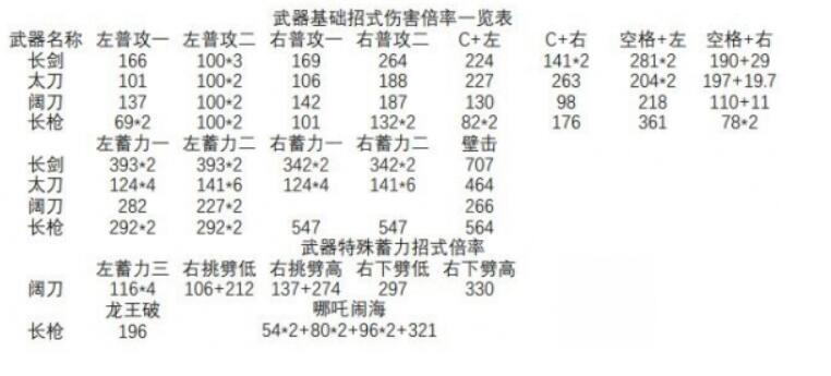 注:倍率为百分比倍率,阔刀的右键蓄力有两种模式,每个模式伤害为三段式浮动伤害,给出了最高伤害和最低伤害;长枪哪吒闹海每一个加号表示你在使用哪吒闹海时的左键按下次数,如一次则只有50*2的伤害倍率,两次则加一次伤害。