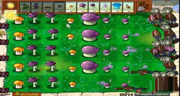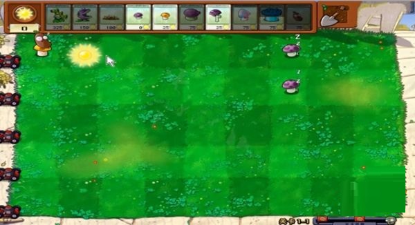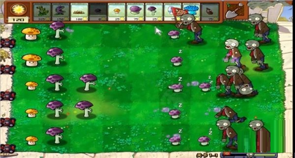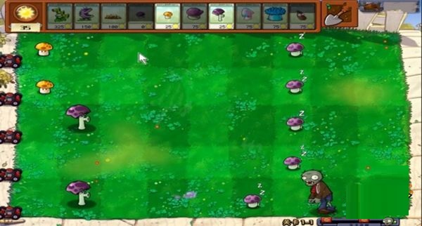 4、在第一波僵尸来的时候至少唤醒一行胆小菇,不花费阳光的小喷菇可以当做肉盾阻止僵尸前进的脚步。