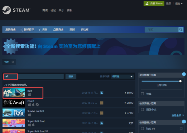 木筏生存游戏在steam平台上叫【Raft】,直接搜索该游戏的英文名字,我们便可以在steam上找到这款游戏了。