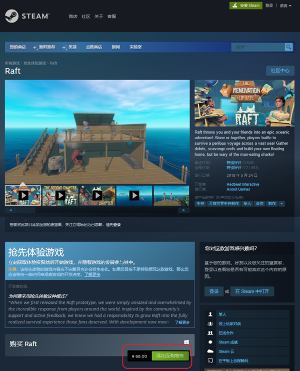 在steam游戏平台上找到木筏生存游戏后,点击【添加至购物车】,然后进行游戏的购买,游戏购买成功后,便可以在电脑上下载并安装木筏生存游戏了。