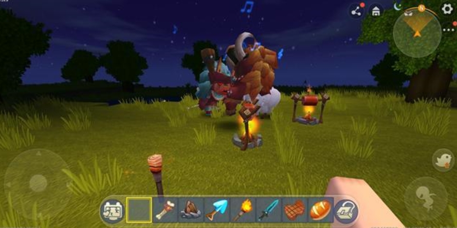第二步:在地上铺好床,并点燃篝火,将生肉放在篝火上,这样烤肉的味道会吸引野人,当野人被吸引过来后,他们会围着篝火跳舞,一段时间后他们会因为吃饱而躺下睡觉。