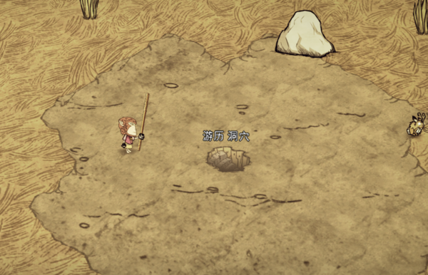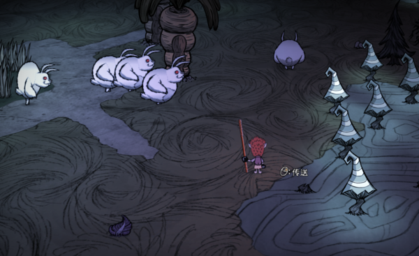 2、通向兔人群的洞穴一般分布在森林中比较突兀的石头底下,用鹤嘴锄敲碎石头,就可以找到下面的洞穴了。兔人集中的地区按地图键是可以看到的,有胡萝卜的区域就是兔人集中的区域。这里要注意的是,兔人是会主动攻击背包中携带了任何肉类的玩家的,所以在见到兔人之前,先吃饱,再将身上所有的肉都扔掉或放进冰箱中储存。一般在洞穴的第二层就可以找到兔人屋了。