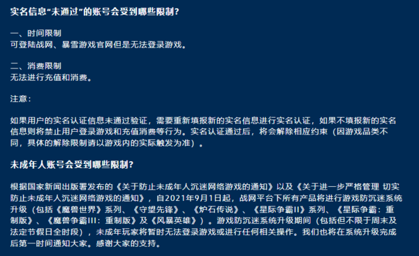 对未成年的用户,在防沉迷系统升级期间,将无法登录游戏进行任何操作;对于未通过实名认证的用户,可以登录战网和游戏官网,但无法登录游戏,也不能进行充值和消费活动。