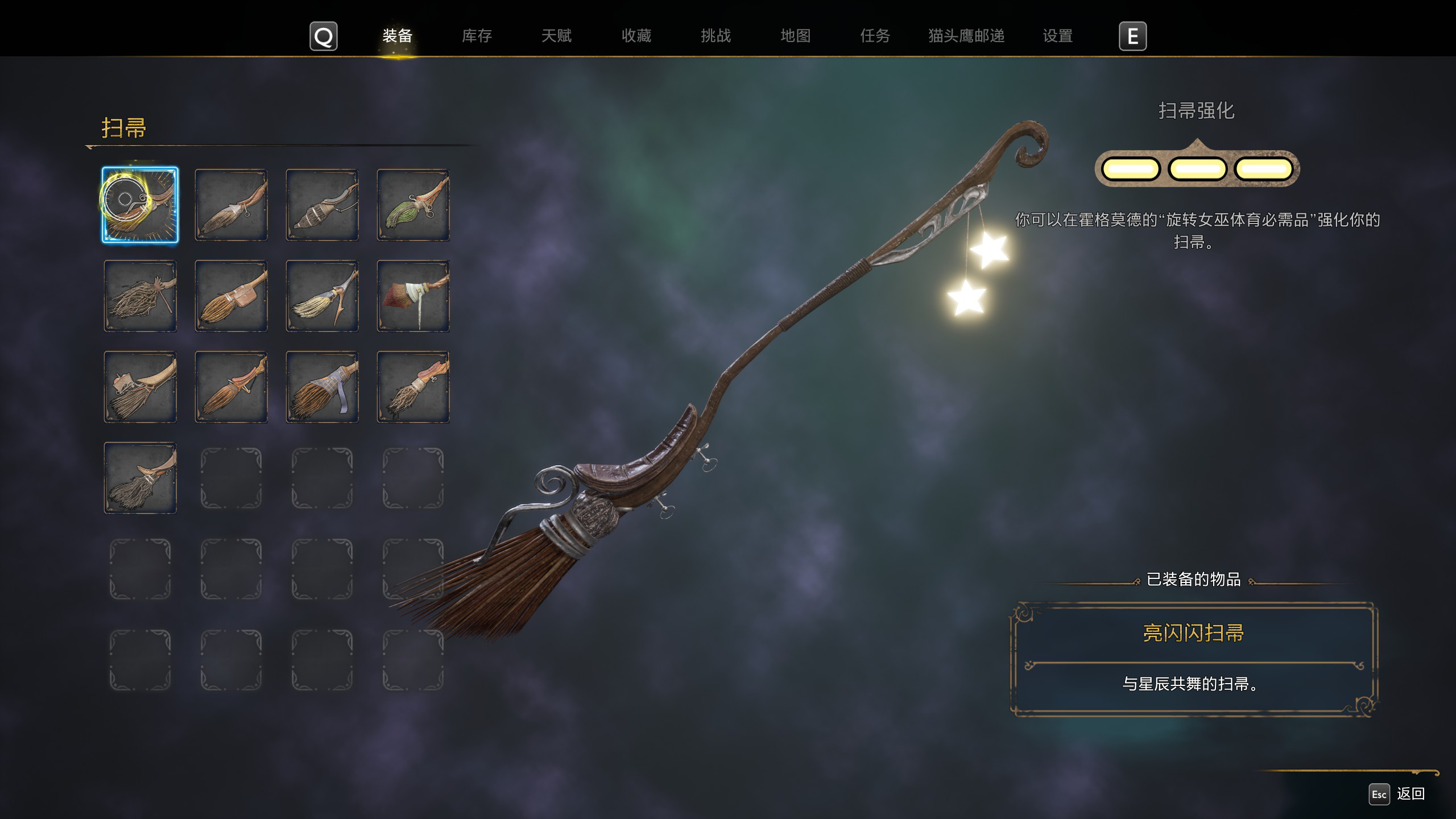 《霍格沃茨之遗》中的亮闪闪扫帚或者说星星扫帚是游戏里长得非常帅的一把扫帚,而想要获得这把扫帚的话可以去地图上找挑战,戳破所有气球组的挑战就是,平时飞行的时候注意一下就能找到这个挑战。