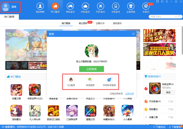 启动安装好的快吧游戏盒软件,然后点击界面左上角的【登录】按钮进行登录,可以使用QQ或微信账号进行登录,也可以使用快吧账号进行登录。