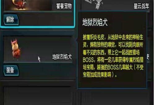 地狱烈焰犬:披覆炽炎毛皮,从地狱中走来的神秘生灵,拥有独特的嗅觉,可以找到肉眼所看不见的东西。这个宠物的技能是:带上它一起战胜猎场BOSS,将有一定几率获得专属烈焰猎场宝箱,越强的BOSS几率越大(不受宝箱加成效果影响)。