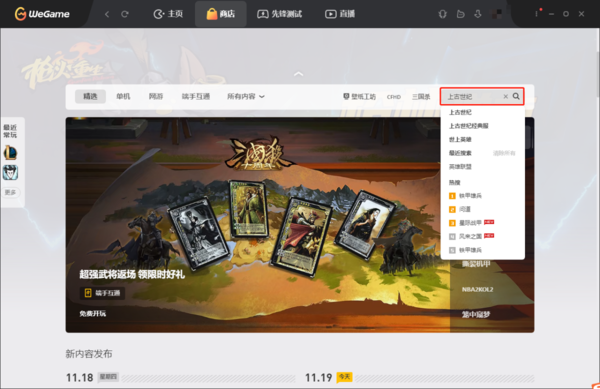 1、点击腾讯游戏平台,进入到主页页面,在右侧搜索栏中输入想要添加的游戏名称,我们这里以上古世纪为例,点击搜索按钮或按下回车键。