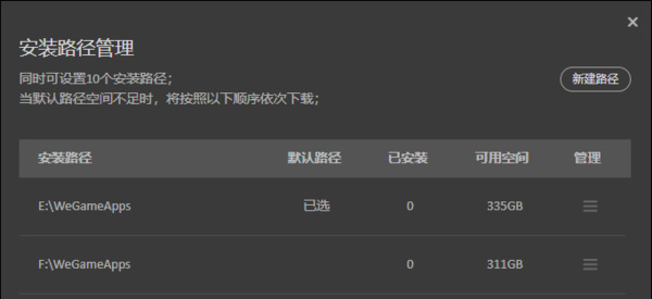 2.游戏安装路径管理:点击安装路径选项下方的“管理”键,就能跳转到安装路径管理界面。在这里,我们可以新建其他的安装路径,设置默认安装路径,进行安装路径排序等。