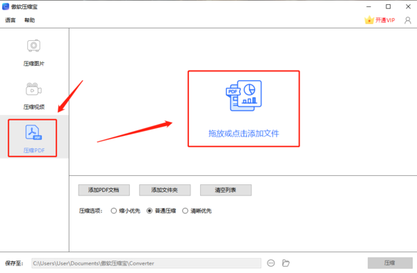 压缩宝中是可以给PDF文件进行压缩的,这款软件中能够压缩的文件类型很多,如果我们需要对PDF文件进行压缩的话,打开压缩宝之后,在主界面的左侧选择“压缩PDF”,然后在右侧添加需要进行压缩的PDF文件,选择完成后导出保存就可以了。