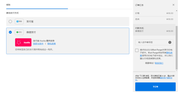 3、在结算界面,可以看到右侧有游戏的名称和对应的价格信息,还请玩家仔细核对一下,确保自己购买的是这款游戏。此外,玩家还可以选择支付方式,有支付宝和微信两种支付方式可以选择。在玩家选择并确认好了,点击右下角的“下订单”,就会弹出支付界面。