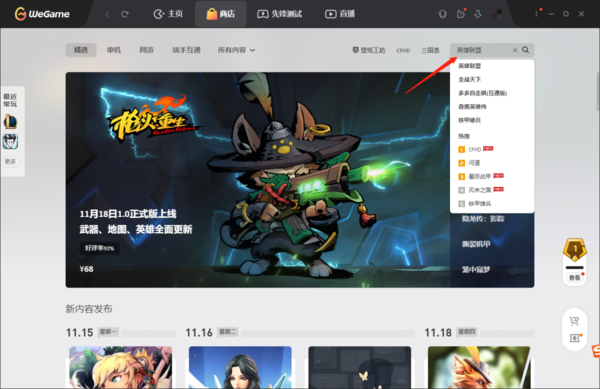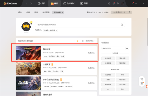 3、进入到客户端的主界面后,找到位于右上角附近的搜索栏。在搜索栏中,输入“英雄联盟”,点击右边的放大镜图标,或按回车键,找到游戏并点击进入游戏介绍页面。