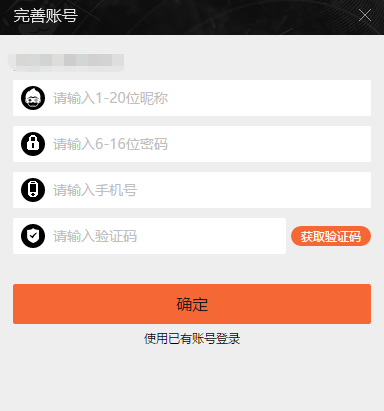 在弹出的完善账号页面中,输入想要设置的账号昵称和密码,绑定手机号并通过验证码进行验证,最后点击“确定”就完成注册了。