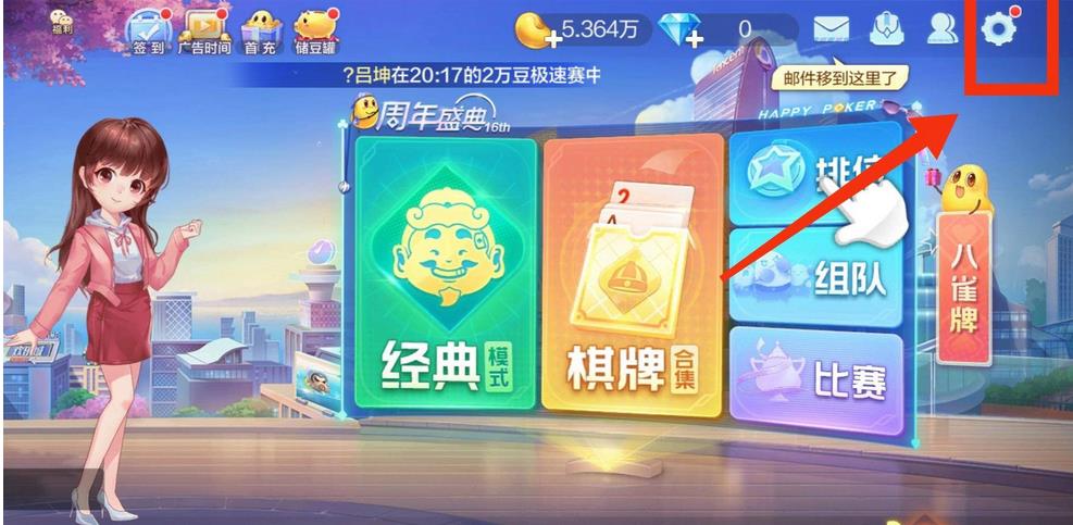 1.进入欢乐斗地主,在游戏首页点击右上角的“设置”图标。如下图所示: