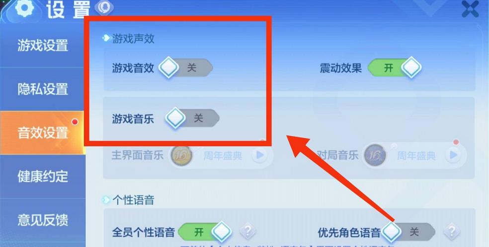 3.在音效设置界面,将游戏声效和游戏音乐的开关设为“关”即可。如下图所示: