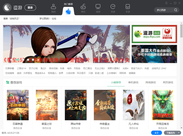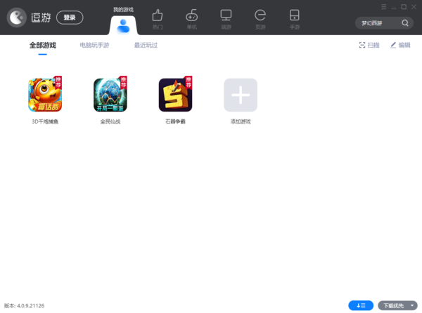 逗游游戏宝库是一款内容丰富的游戏合集软件,操作简单易上手,功能多。逗游游戏宝库为玩家提供游戏软件的下载服务,超过100000款游戏都可以在逗游游戏宝库中找到,在不断的更新之中,其功能强大之处在于,在用户下载一款游戏前,就可以由系统自动诊断电脑机器的硬件配置是否满足游戏需要,以及相关的软件的情况进行自动匹配,只需几秒,就可以将匹配结果回馈给用户。