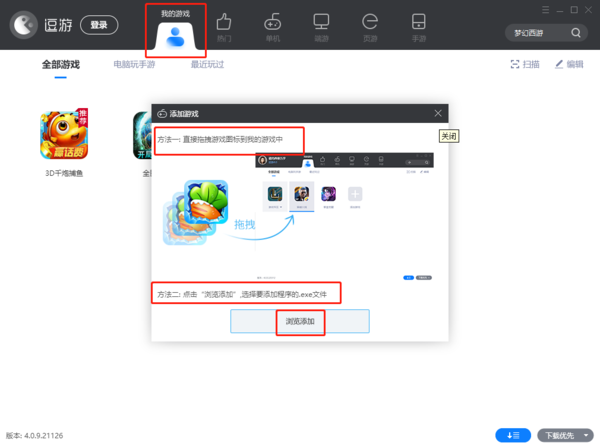 1、点击逗游游戏宝库上方一栏中的我的游戏,直接将已下载好的游戏拖拽进去。