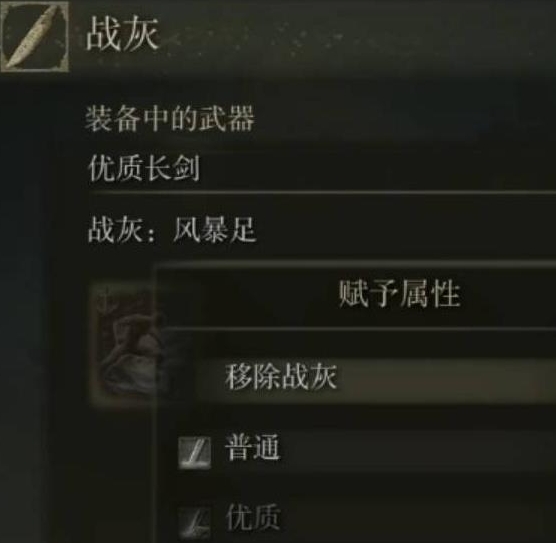 2、选择需要附加战灰的武器。请注意,不同的武器可附加的战灰可能会有所不同,具体取决于武器的种类。