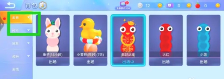 3、进入背包后,在左侧栏目中找到并点击“皮肤”选项。