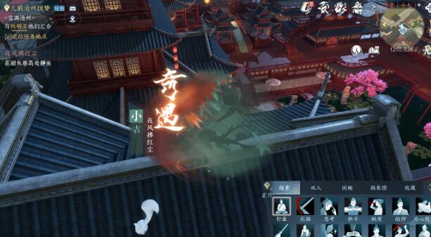 1、玩家在晚上来到汴京1210,836进行打坐,触发夜风拂红尘奇遇。