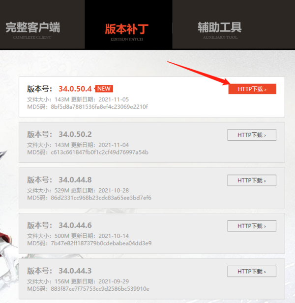 到了下载页,点击页面上方“版本补丁”,即可找到版本补丁包,玩家可根据情况选择对应的补丁包进行下载更新。