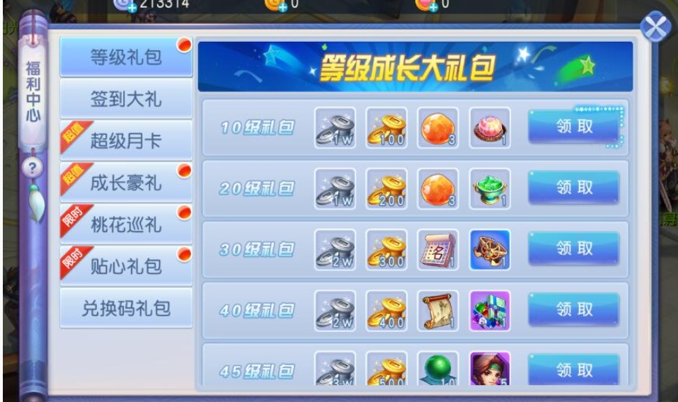 2、点击左侧菜单的“福利按钮”我们可以领取等级和成长礼包,礼包里也包含了桃心奖励,一般十级可以获取100桃心的奖励