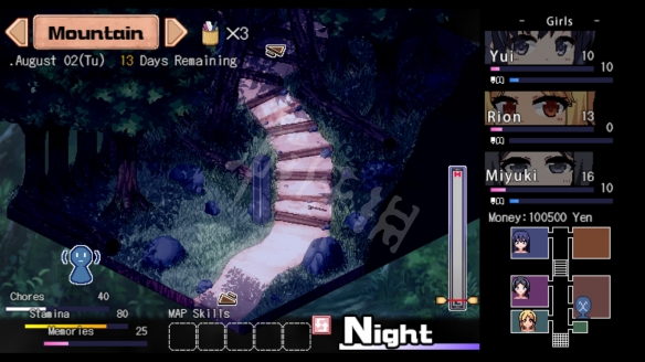 15号的时候,会说学校仓库夜晚有幽灵或者可疑人士,其实去看看最好,虽然叫你别去(这种游戏肯定要去啊),然后就会看到有人卖东西,这可是好东西啊。每样1000元,有3种,分别是让好感度提高20点,让警戒度提高30点,作业免做证——作业完成度增加100,这3样,作业免做证可以直接跳过小游戏。直接获得胜利。