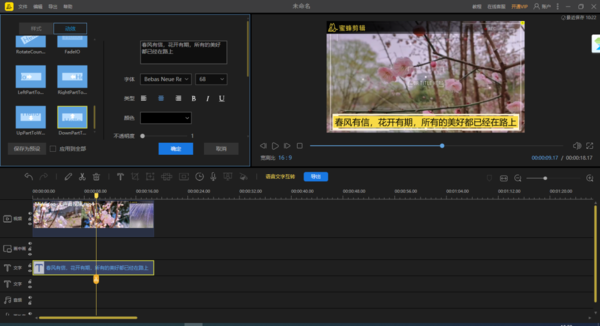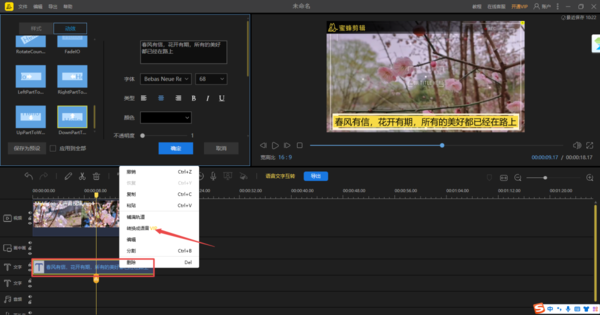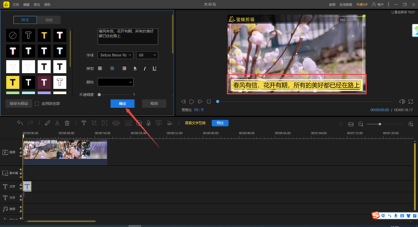 4、然后双击文字轨道上的文字,接着在素材区界面中,我们就可以对文字的内容、样式、动效、字体类型、大小、颜色等参数进行设置了。