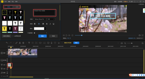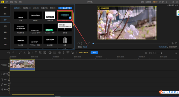 3、接着在软件的素材区的文字界面中,找到想要使用的文字效果,然后点击它右下角的【+】加号按钮。