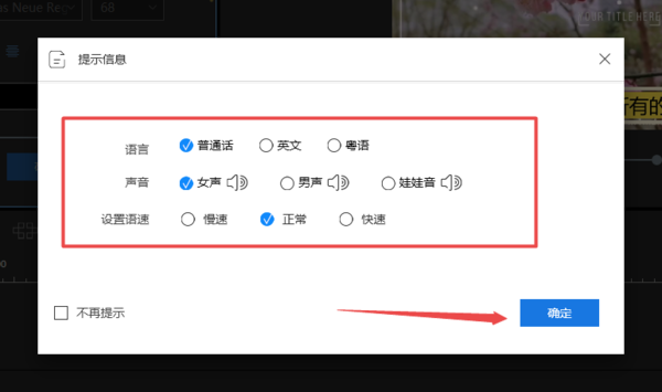 8、接着在弹出的提示信息窗口中,我们根据自己的实际需求来选择语音的【语言】、【声音】以及【设置语速】,全部设置好以后,点击【确定】按钮。