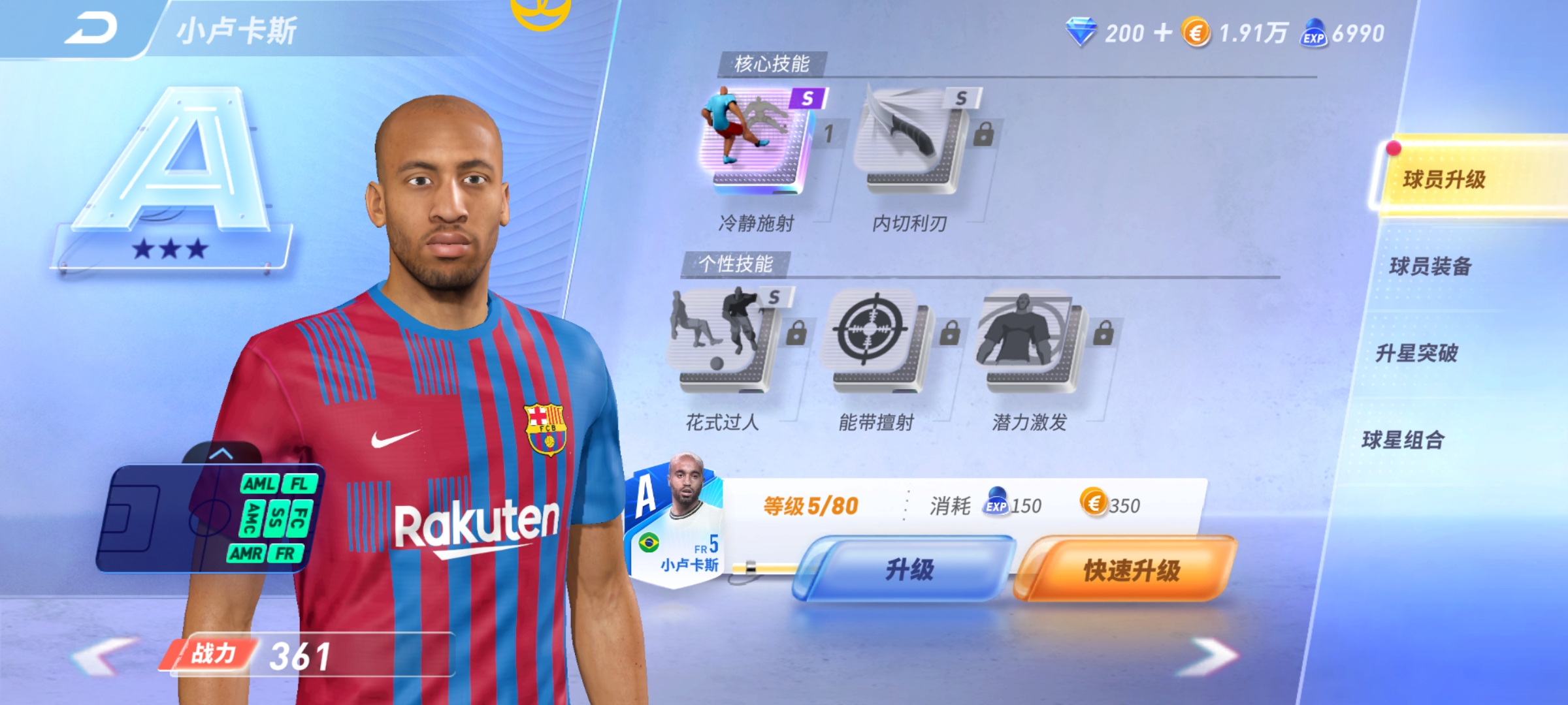 球员的核心技能和个性技能需要球员升到一定等级才能解锁,一般球员达到30级和50级可以解锁另外两个核心技能,每次升级需要消耗一定的球员经验和金币,等级越高需要消耗的也就越多。