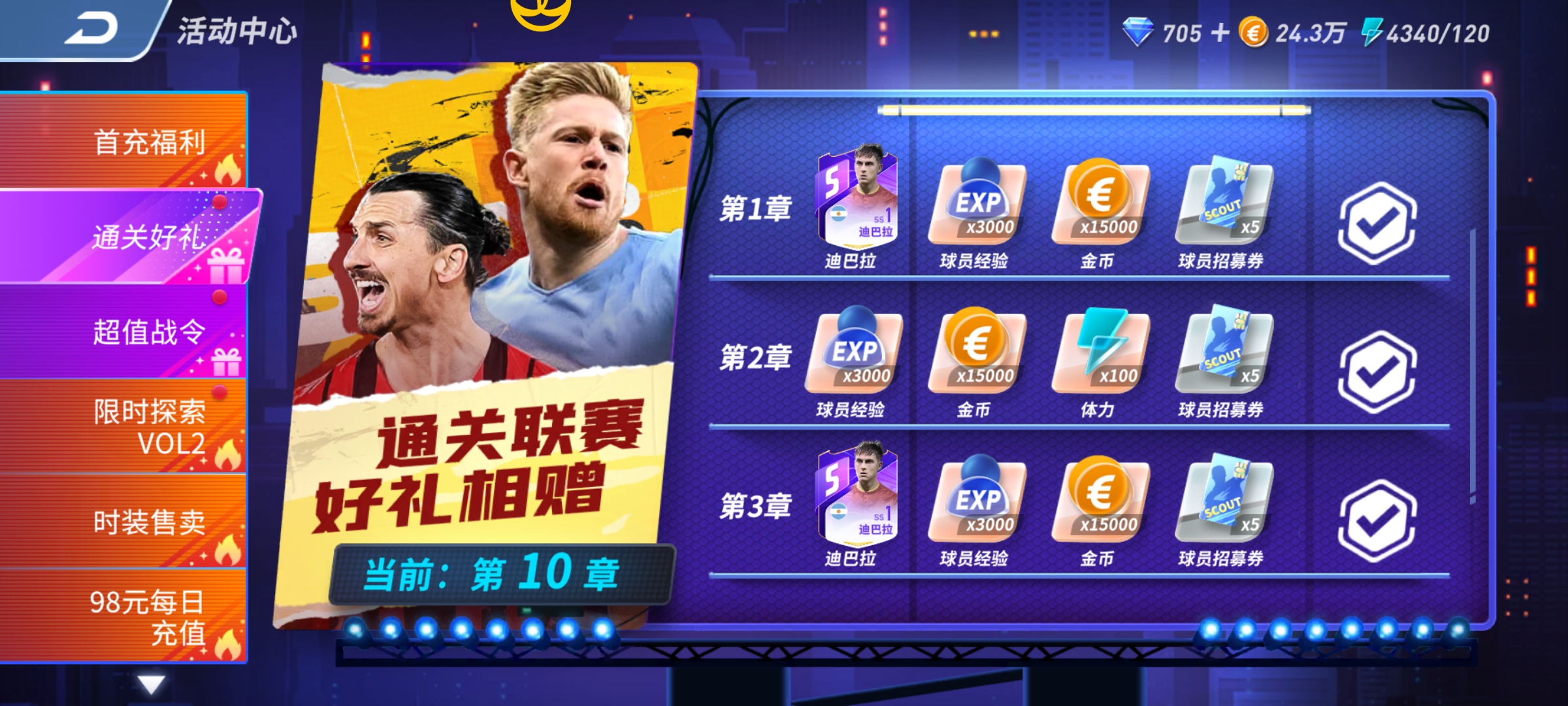 通过挑战巅峰之路,每一章挑战成功后都可以领取15000金币,除此之外还有非常重要的球员经验和体力值奖励,零氪玩家必肝!