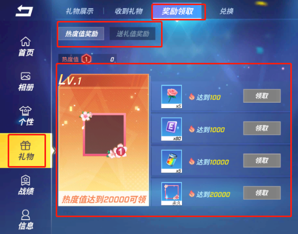 1.热度和送礼值:玩家收到和送出的礼物越多,获得的热度和送礼值等级也就会越高,不断提升热度和送礼值等级,就能领取奖励。