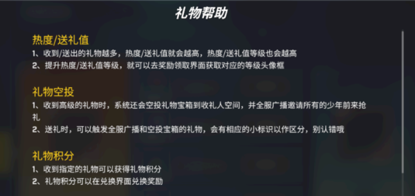 2.礼物积分:收到游戏指定的礼物之后,玩家可以获得一定的礼物积分,使用礼物积分可以在兑换界面兑换礼物。