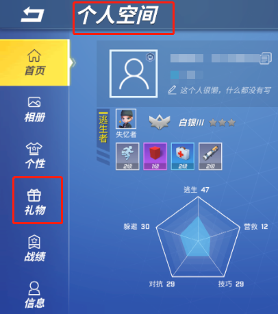 步骤三:在用户个人空间界面,点击左侧的“礼物”选项,就能查看玩家收到的礼物了。