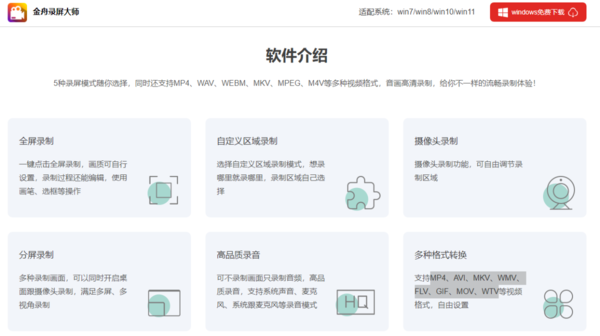 金舟录屏大师也是游戏录制方面的一把好手,我们作为使用者,可以在金舟录屏大师中自定义录屏区域,全屏窗口随心所欲;而且在录制完视频后,我们可以自由选择游戏集锦的画质,即使是2k视频,也是轻松拿捏;另外,金舟录屏大师在格式上也是灵活的,有MP4、AVI、MKV、WMV、?FLV、GIF、MOV、WTV等多种格式选择。