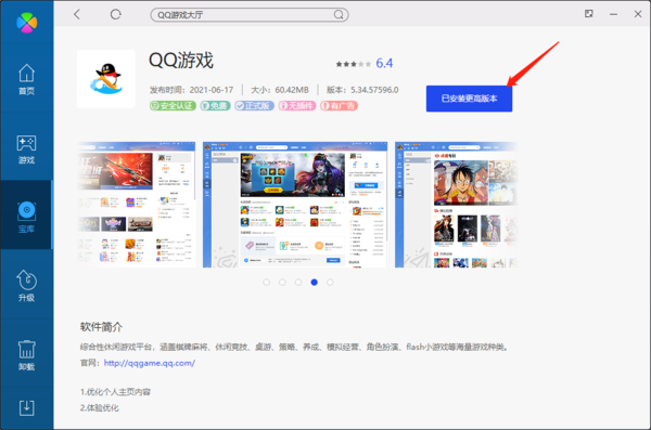 搜索后点击QQ游戏大厅,弹出软件详情界面,之后点击下载即可(由于电脑已安装QQ游戏大厅,故这里显示的是“已安装更高版本”)。