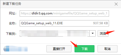点击“下载PC版”之后,稍等片刻,浏览器就会弹出下载框,在这个下载框里,我们可以选择把QQ游戏大厅电脑版放在自己电脑的某个磁盘的某个文件夹,在选择完成后可以直接点击下方的“下载”按钮,进行下载。